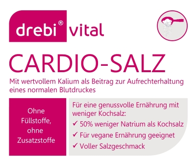 drebivital Cardio-Salz hat eine spezielle Zusammensetzung und ist für eine Ernährung mit weniger Salzkonsum geeignet. Es ist eine geschmacklich hervorragende Ergänzung zu herkömmlichem Kochsalz, weil es einen vollen Salzgeschmack aufweist, aber 50% weniger Natrium enthält als Kochsalz. drebivital Cardio-Salz gibt damit sehr viel Lebensqualität zurück, wenn man Salz im Essen reduzieren muss.